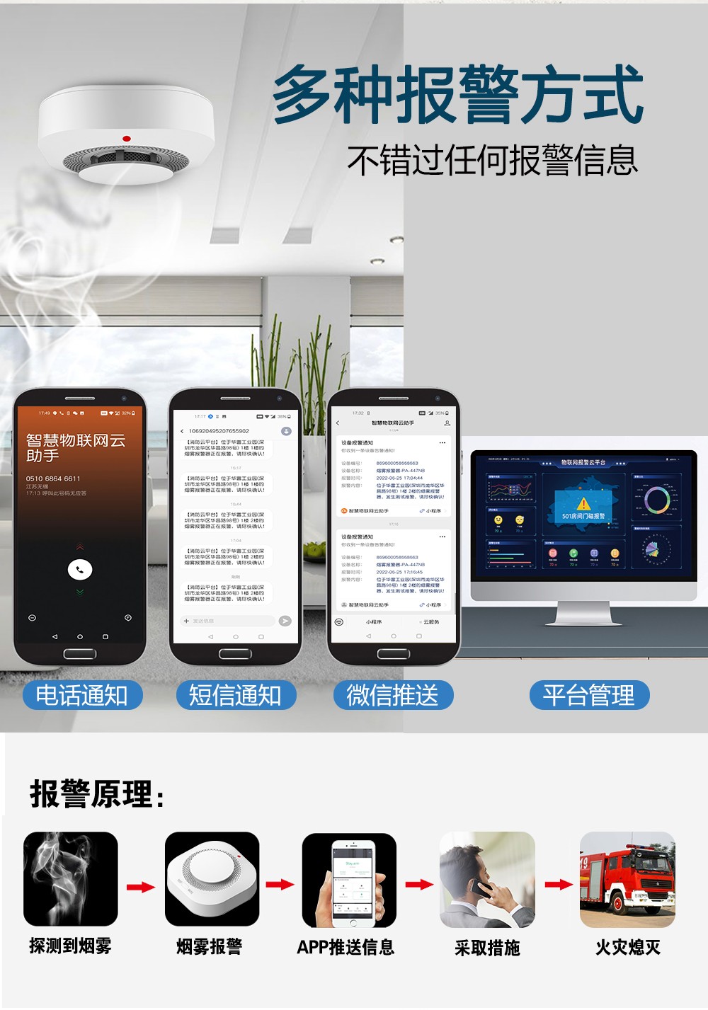 火灾警情实时监控,多种途径报警推送,快捷高效