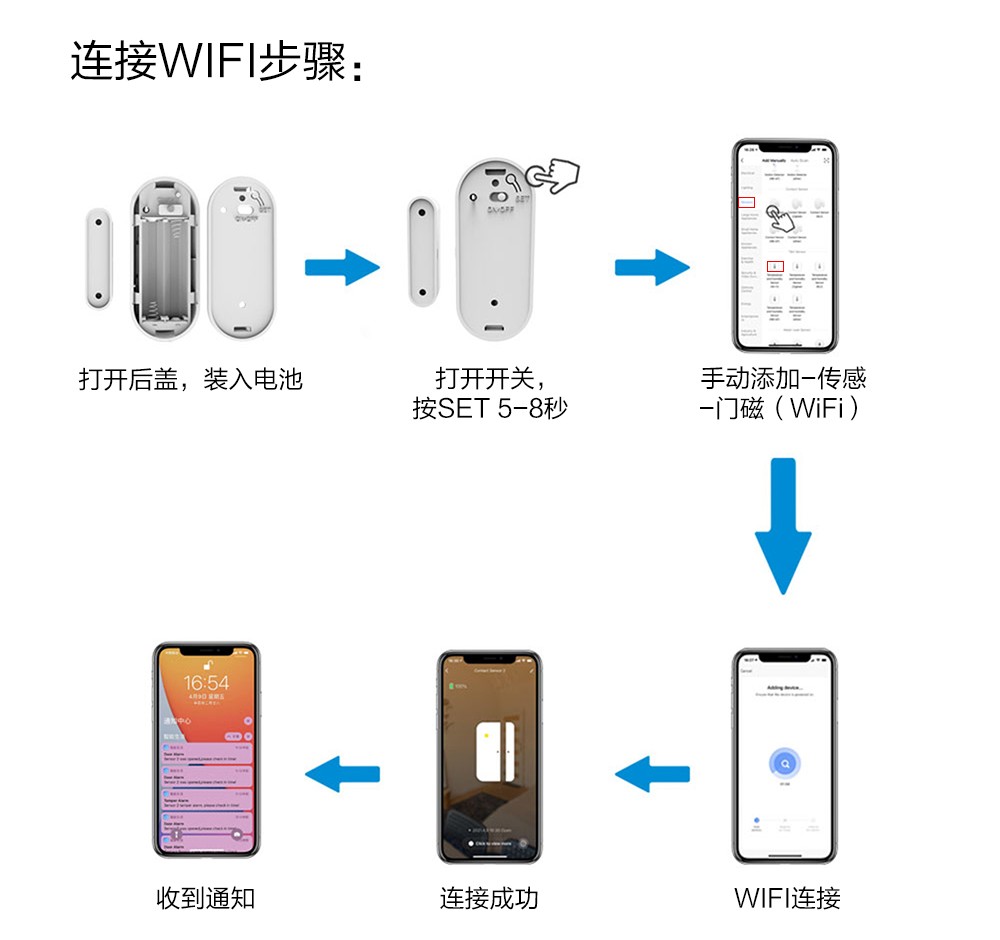门磁是由无线发射模块和磁块两部份组成,在无线发射模块有两个箭头处有一个"钢簧管"的元器件,当磁体与钢簧管的距离保持在1.5厘米内时,钢簧管处于断开状态,一旦磁体与钢簧管分离的距离超过1.5厘米时,钢簧管就会闭合,造成短路,报警指示灯亮的同时向主机发射报警信号。