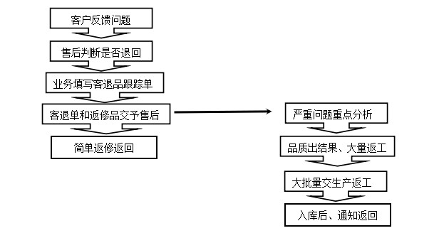 1)当售后接到客户反馈的问题后,判断是否需要返回维修,需要退回的,跟业务交流后,业务部通知客户退回。业务收到客退品后,填写《客退品跟踪单》和返修品交维修部。