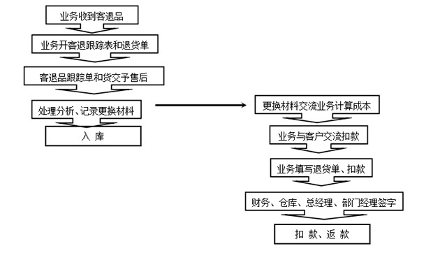 3 客户要求退货的,由业务员跟客户交流后,决定退货的,业务 部收到退货产品,并开出《客退品跟踪单》和《退货单》交给售后部检测维修包装好后,重新入库。《退货单》按照正常流程程序走。
