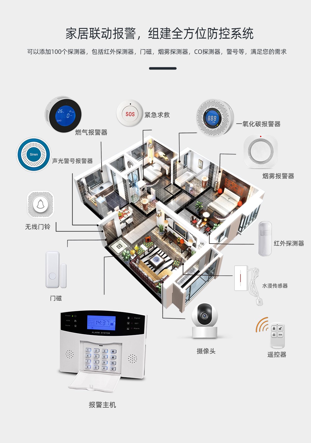 报警编程:求救、火灾、煤气、大厅、窗户、阳台、周界;