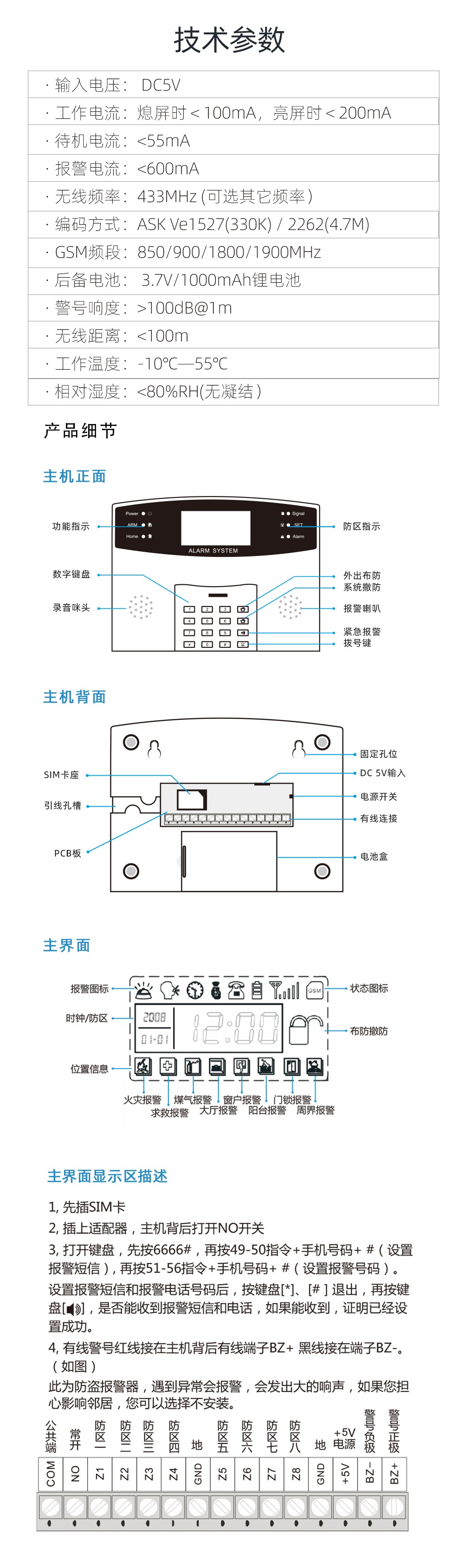 预设2组短信手机号码,主机自动发送短信报警;