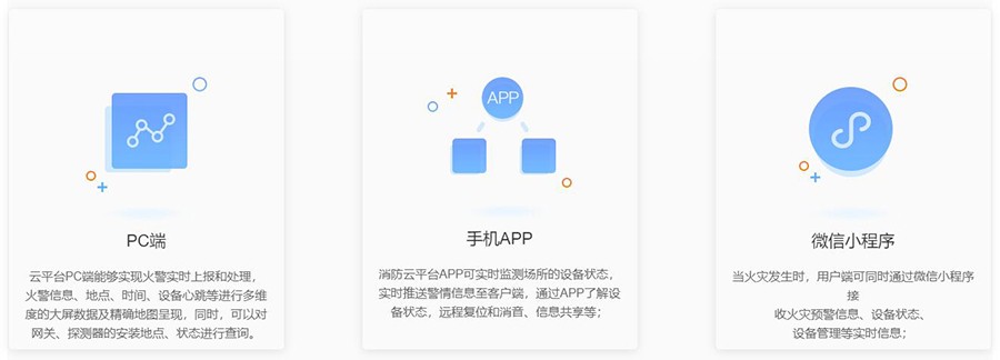 ![]() | 系统架构 城中村火灾防控系统基于NB-IoT无线网络,运用物联网、移动互联网、大数据、云计算技术,实时监控区域内消防设备/设施运行状态,当发生火灾警情,可通过云平台实时弹窗、自动语音电话、手机APP/小程序信息推送通知消防单位、及管理人员/用户等,具有发现警情早、告警流程简单、早处理等功能,有效解决校园场所消防监督管理难点。 |