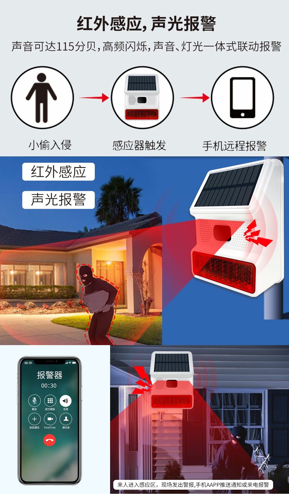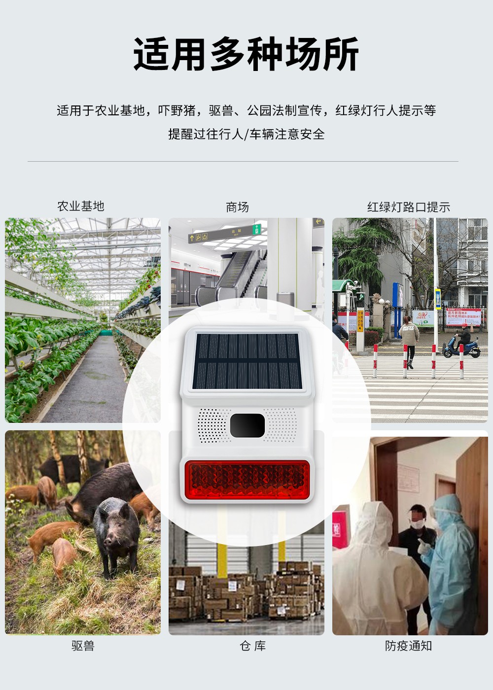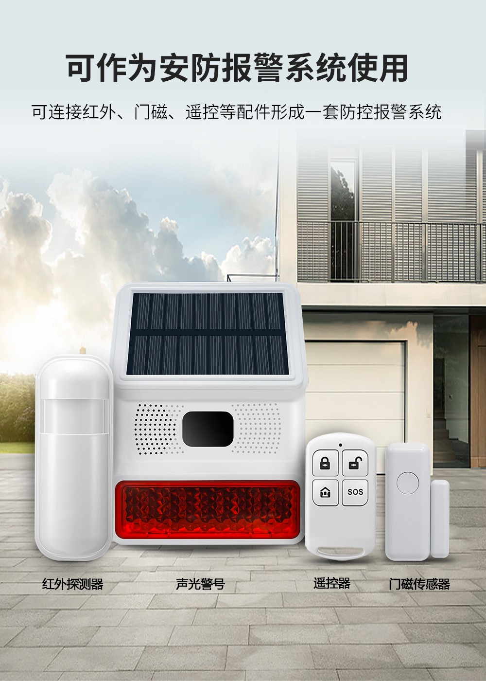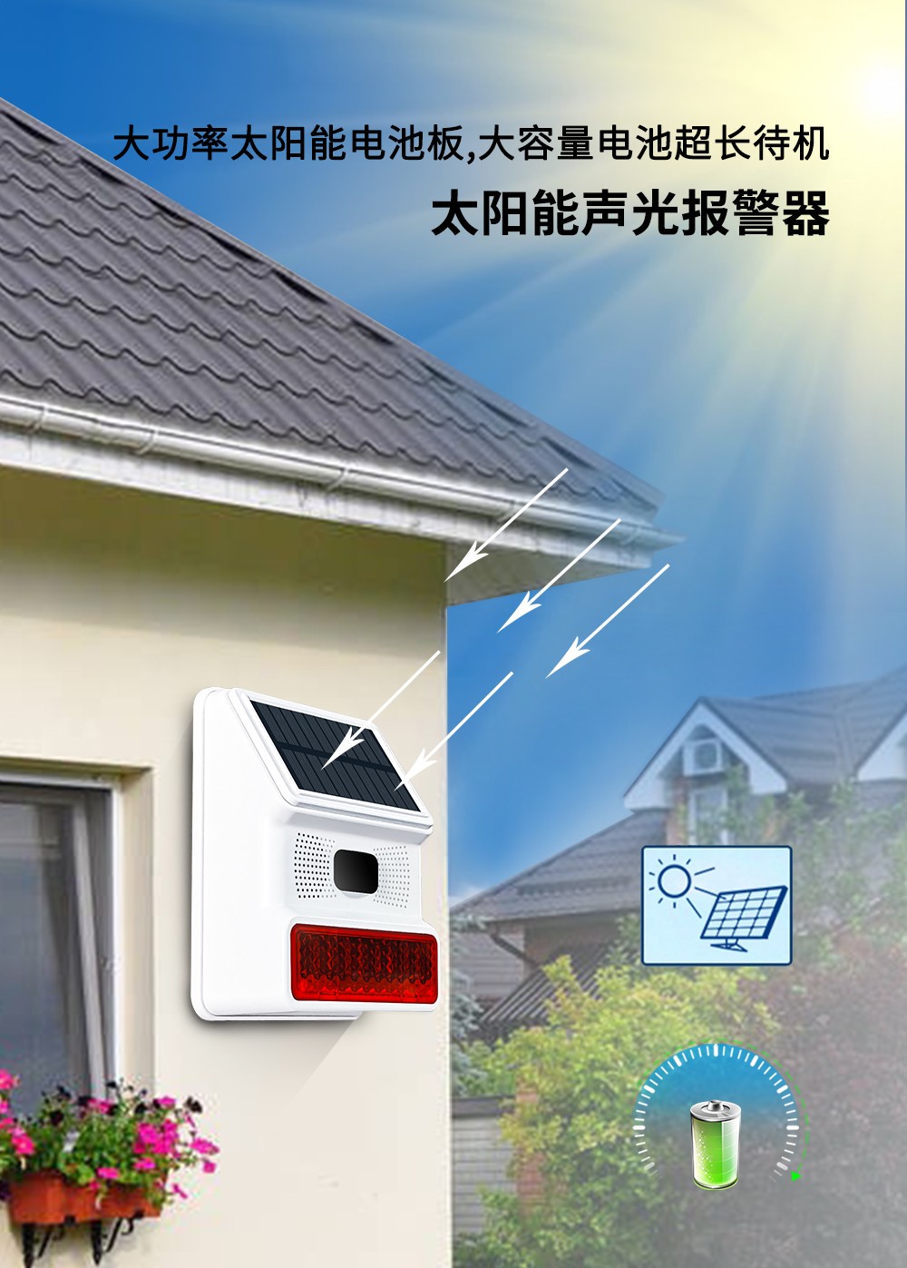 无线太阳能红外声光报警器分为联网型和RF型,探测距离8-12米,角度110度,这是一款可以自定义报警语音,高性能的带太阳能充电的户外数字被动红外现场声光报警器。能够有效防水、防尘、防虫、防风和其他户外干扰因素。该产品应用如下先进技术:超低功耗芯片技术,WiFi联网技术,NB/4G无线通讯技术,太阳能持续充电和供电,音频和高亮度闪灯同时报警提醒。使用稳定、性能先进、IP-65防水的整体结构设计,可以应用于商铺、别墅、养殖场、森林防火、高压电杆、公园、仓库、码头等一切需要现场语音和强光警示的地方。